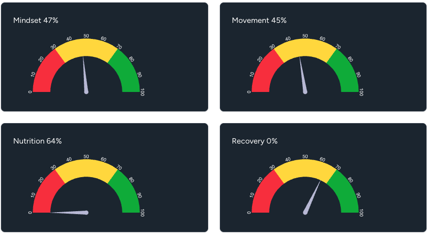 - Scoreregistratie: Dagelijkse of wekelijkse evaluaties op de pijlers Mindset, Movement, Nutrition en Recovery om groei en uitdagingen inzichtelijk te maken.